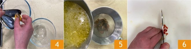 Once opened, shell them 4. Strain the cooking water and pour it over the mussels, so they don't dry out 5. Now chop the fresh chili 6.