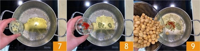 Nello stesso tegame in cui avete cotto le cozze, versate un altro giro d'olio, uno spicchio d'aglio tritato 7 e il peperoncino fresco 8. Lasciate soffriggere per un paio di minuti, quindi versate i ceci precotti 9 e rosolate brevemente.