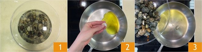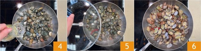 When the oil begins to sizzle, deglaze with the white wine 4 and let the alcohol evaporate, then cover with a lid 5 and let the clams open over high heat 6; it will take about 5 minutes.
