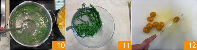 Blanch for about a minute 10, then drain, keeping the water aside, which you'll use to cook the pasta 11. Wash and halve the cherry tomatoes 12.