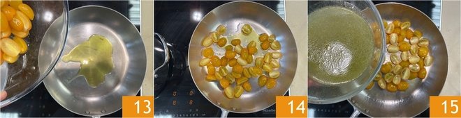 In a pan, heat a drizzle of oil, then add the cherry tomatoes 13 14 and season with the clam cooking water 15. Cook for 4-5 minutes.
