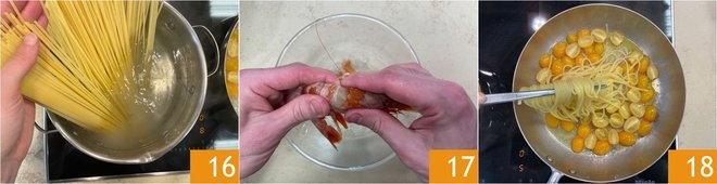 Now cook the linguine al dente in boiling water, following the time indicated on the package 16. Meanwhile, clean the shrimp by removing the head, shell, and vein 17. When the pasta is ready, drain it directly into the pan with the cherry tomatoes 18.