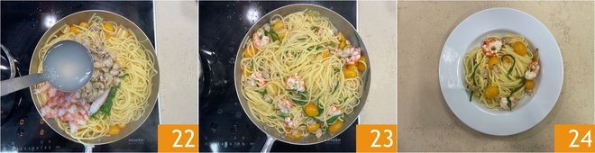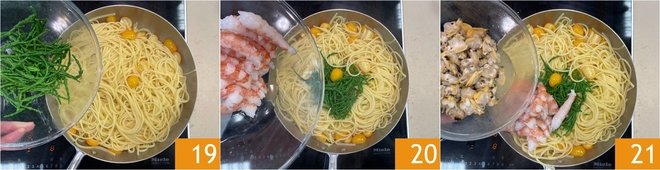 Add the samphire 19, shrimp 20, and shelled clams 21.