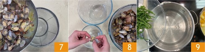 Once opened, drain the clams through a strainer to collect the cooking water 7. Shell half of them and set aside along with the whole ones 8. In another pot, bring water to a boil, then add the samphire 9.