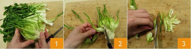 To prepare pasta with cooked puntarelle, start by cleaning the latter. Wash them well under running water, cut off the end of the stem with a knife; take only the central leaves, the smaller and tender ones 1, setting aside the others for a moment. Using a small knife, detach them from the stem 2 and cut them into julienne strips 3.