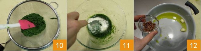 Sift it into another bowl 10, then add grated Pecorino and black pepper; mix 11 and set aside your cream. In another pan, pour about 20 g (0.7 oz) of oil, 2 cloves of garlic, and the anchovy fillets drained from their oil 12.