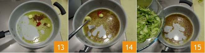 At this point, take one of the 2 chili peppers, split it in half, and remove the seeds and the outer stem. Add it to the pan 13 and turn on the heat. Cook for a few minutes until the anchovies have melted and the garlic is slightly golden, then remove both the garlic and the chili pepper using kitchen tongs 14. Meanwhile, bring the reserved puntarelle cooking water back to a boil. Drain the central puntarelle from the ice water and add them to the sauté 15. Cook for about 7 minutes until they are tender and turn off the heat.