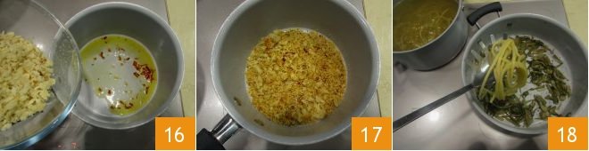In the meantime, throw the pasta into the water, which should now have reached a boil. While the pasta cooks, toast the bread crumbs. Pour a drizzle of oil into a pan and add the remaining chili pepper, seeds removed and chopped. Let it lightly brown and add the coarsely crumbled bread crumbs by hand 16. Stir continuously until well toasted 17. As soon as the bucatini are cooked, drain them and pour them directly into the pan with the julienne puntarelle 18; then add the puntarelle cream 24