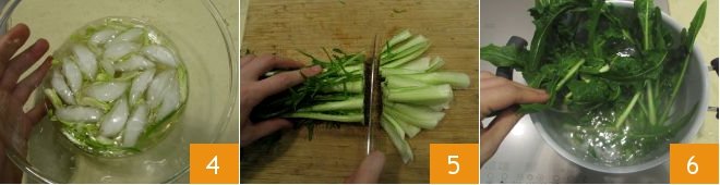 Immediately place them in ice water, so they won't spoil 4. Put a sufficiently large pot of salted water on the stove. Take the outer puntarelle and with a knife, remove the final part of the stem, the white part that would be tough when cooked 5. As soon as the water reaches a boil, blanch the outer puntarelle for about 10 minutes 6.