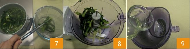 When they are tender, drain them, reserving the cooking water (which will be used to blend them and cook the pasta) 7 and let them cool slightly. Then transfer them to a blender 8, pour about 50 g (1.76 oz) of the cooking water 9, and blend the puntarelle until you get a cream.