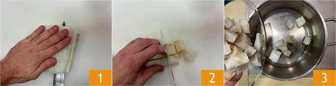 To prepare pasta with creamed cod, anchovies, and fennel, first, prepare the creamed cod. Remove the skin 1, take out the bones with kitchen tweezers, and cut it into pieces of about an inch 2. Transfer the cod to a saucepan 3.