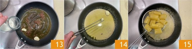 Let them melt while stirring, then add the cream 13. Cook for a few seconds and remove the garlic cloves 14; set aside. Drain the pasta al dente and transfer it to the pan 15.