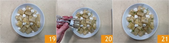 Garnish each plate with dollops of creamed cod 19, add a grind of black pepper 20, and a sprinkle of chopped fennel 21. Your paccheri are ready to serve!