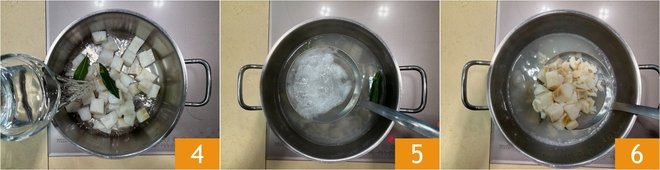 Add the bay leaves and cover with water 4, then cook for 30 minutes from the boil, skimming off the foam from time to time with a skimmer 5. The cod will be cooked when the pieces flake apart, then drain it 6.