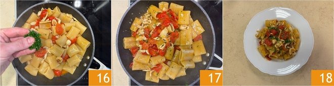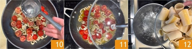 Pour a ladle of water 10, cover with a lid 11, and continue cooking for about 15 minutes, until the cherry tomatoes have released part of their juice. In the meantime, cook the paccheri al dente in abundant salted water 12.