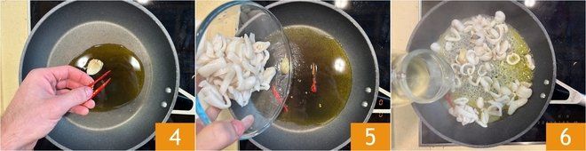 In a large pan, heat a drizzle of extra virgin olive oil, add the crushed garlic and two chili peppers 4. Sauté until the garlic is golden, then add the cuttlefish 5 and cook them for 3-4 minutes. Deglaze with the white wine 6 and let it evaporate. Meanwhile, bring a pot full of water to a boil, which will be used for cooking the pasta.