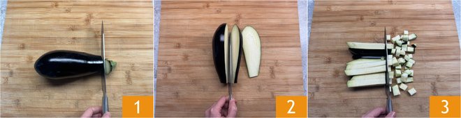 To prepare the pasta with eggplant cream and cherry tomatoes, start with the eggplants: wash them and trim the ends 1. First, slice them 2, then cut into sticks and finally into 1/2-inch cubes 3.