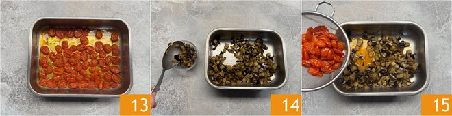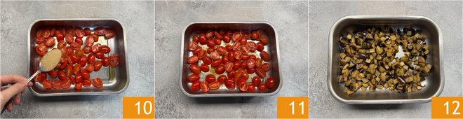 Add salt and brown sugar as well 10. Bake both the eggplants and cherry tomatoes in a preheated static oven at 392°F for about 35-40 minutes, placing the trays on the same rack 11. After the cooking time, the eggplants will be golden 12.
