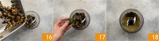 Transfer the seasoned eggplants to a blender 16, add a few basil leaves 17 and blend thoroughly 18.