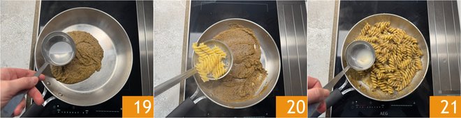 Cook the pasta in boiling salted water. Meanwhile, pour the eggplant cream into a pan and thin it with a ladle of the cooking water 19. Drain the pasta al dente and transfer it directly to the pan 20, then toss it, adding water as needed 21.
