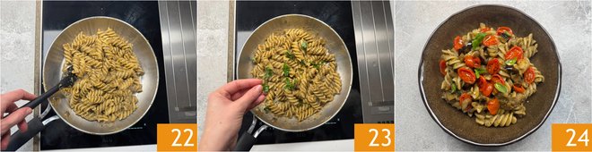 Mix well 22 and turn off the heat, then finish with a drizzle of raw oil and more fresh basil 23. Plate and garnish with cherry tomatoes, the reserved eggplants, and a few more basil leaves. Your pasta with eggplant cream and cherry tomatoes is ready to be served 24!