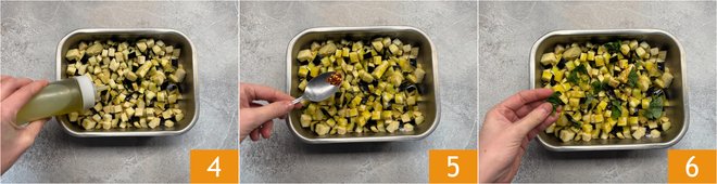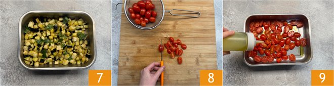 Mix with your hands to evenly flavor the eggplants, then set aside 7. Proceed with the cherry tomatoes: cut them in half 8 and season with oil 9.