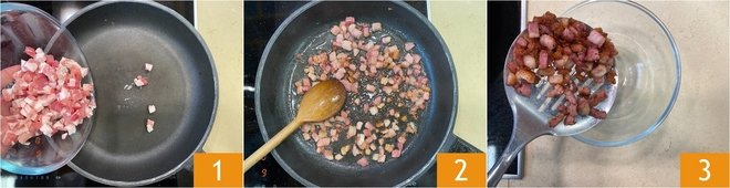 To prepare the pasta with leeks, pecorino and pancetta, start by filling a pot with plenty of salted water and bring it to a boil. In the meantime, in a large skillet add the pancetta cut into dice 1 and let it brown without adding any fat 2 until it becomes golden and crispy. Then drain off the excess fat and transfer the pancetta to a small bowl 3. Set aside.