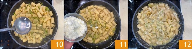 Add a ladleful of cooking water (about 1/4 cup) 10, then add the grated pecorino 11 and a grind of black pepper. Toss everything quickly to combine the flavors and obtain a creamy consistency 12.