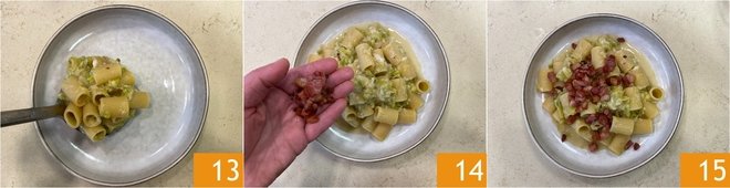 Plate the pasta 13, garnish with the crispy pancetta 14 and serve your pasta with leeks, pecorino and pancetta 15!