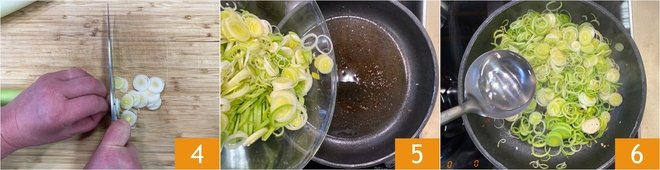 Clean the leeks by removing the toughest part, then slice them thinly 4. If needed, pour a drizzle of extra virgin olive oil (about 1 tbsp) into the same skillet where you cooked the pancetta, add the leeks 5 and cook over low heat for about 10 minutes, until they are soft. Moisten with a ladleful of the pasta cooking water (about 1/4 cup) to help them finish cooking.