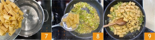 Cook the pasta 7 and drain it al dente directly into the skillet with the sauce 8, then toss briefly 9.