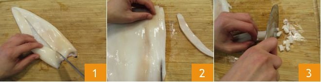 To prepare the pasta with lettuce pesto and squid, start with the latter. We bought pre-cleaned squid, but if yours are not, you can follow our guide: Cleaning Squid. Score the mantle 1 and open it like a book. Using a knife, first cut it into strips 2, then into small cubes 3.