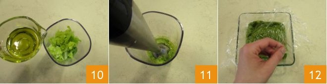 Then pour in the oil 10 and season with salt. Blend everything with an immersion blender 11 until you obtain a smooth cream. Then transfer the lettuce pesto to a small bowl and cover it with cling film 12.