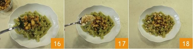 Transfer the pasta onto plates and add some squid ragù on each 16. Garnish with crumbled taralli 17 and serve your pasta with lettuce pesto and squid 18.