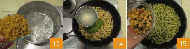 Cook the pasta in abundant salted boiling water 13 and drain it al dente, transferring it directly into a pan. Add the lettuce pesto, a ladle of cooking water 14, and toss everything together. Then add half of the squid ragù 15 and mix again.