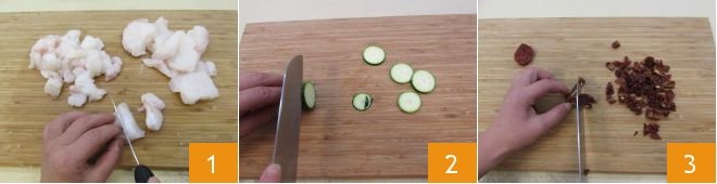 To prepare the pasta with monkfish, zucchini, and sun-dried tomatoes, start by cutting the monkfish into cubes about 3/4 inch 1. Trim the zucchini and slice them into thin rounds 2, then cut the sun-dried tomatoes into small pieces 3.
