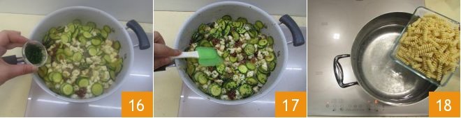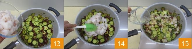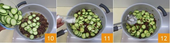 When they have softened, add the zucchini 10, adjust with salt 11 and pepper, and mix them with the other ingredients. Pour the remaining 2 oz of water 12 and let cook for 10 minutes over low heat.