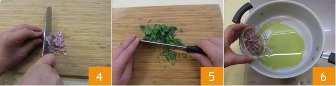 Finely chop the shallot 4 and the parsley 5. Proceed with the preparation of the sauce: take a non-stick pan with a wide base and drizzle it with a little oil. Then, let the shallot sauté over low heat for about 4-5 minutes 6.