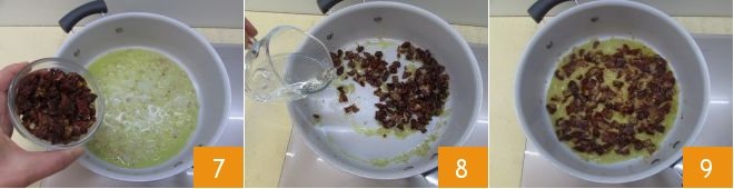 Add the tomatoes 7 and 2 oz of water 8 and let cook over low heat for another 5 minutes 9.