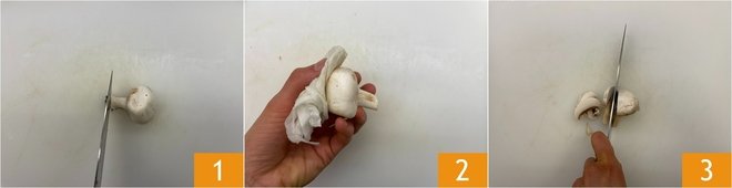 To prepare pasta with mushrooms and speck, start by cleaning the champignons. First, remove the root part, which is more earthy, with a knife 1. Then clean the entire mushroom with a damp cloth 2. It's important not to wash it under water. At this point, slice the champignons 3.