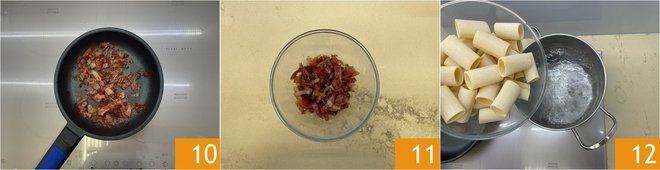Toast it on medium heat until it becomes crispy 10, then set it aside 11. As soon as the water boils, cook the paccheri 12.