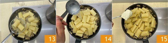 Drain them al dente and transfer them to the pan with the mushrooms 13; add a ladle of cooking water 14 and the stracchino 15.
