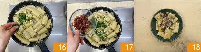 Sauté well until you achieve a creamy result. If necessary, add another ladle of cooking water. Finish with chopped parsley 16 and about half of the speck 17. Plate and decorate with the remaining speck 18.