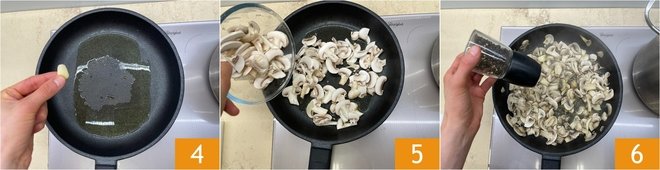 In a large pan, pour a drizzle of oil and a clove of garlic 4; turn on the heat and let it infuse, then add the mushrooms 5. Add salt and pepper 6 and cook for a few minutes. Meanwhile, put a pot of salted water on the stove to boil for cooking the pasta.