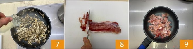 When the mushrooms' water has evaporated, deglaze with white wine 7 and cook for a few more minutes. Meanwhile, cut the speck into strips 8 and place it in a small pan 9.