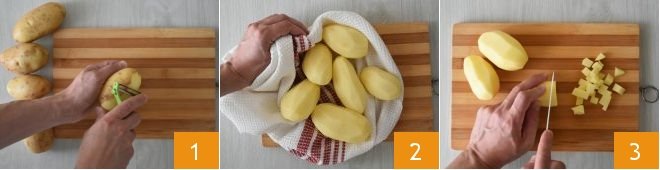 To make the pasta with onions and potatoes, first peel the potatoes 1, then wash and dry them 2 before cutting them into cubes 3.