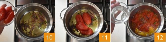 let it season for another minute, then add the peeled tomatoes (10-11) and cook for 5 minutes. At this point, add a glass of pasta cooking water 12;