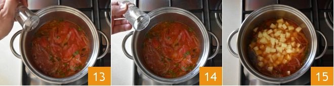 salt 13, pepper 14, also add the cubed potatoes 15 and continue cooking for another 20 minutes or until the potatoes are tender.