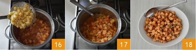Now place a pan full of salted water on the heat, and when it comes to a boil, cook the pasta al dente following the time indicated on the package. Once the pasta is al dente, drain it directly into the pan with the sauce 16. Stir 17 to flavor and finish cooking. Serve the pasta with onions and potatoes hot 18.