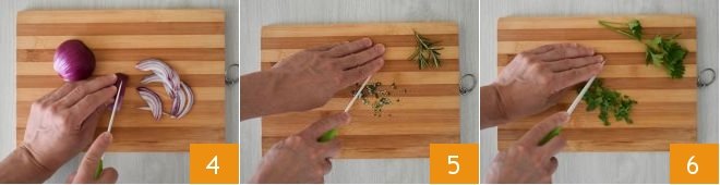 Peel the onion and slice it 4, chop the rosemary first 5 and then the parsley 6.